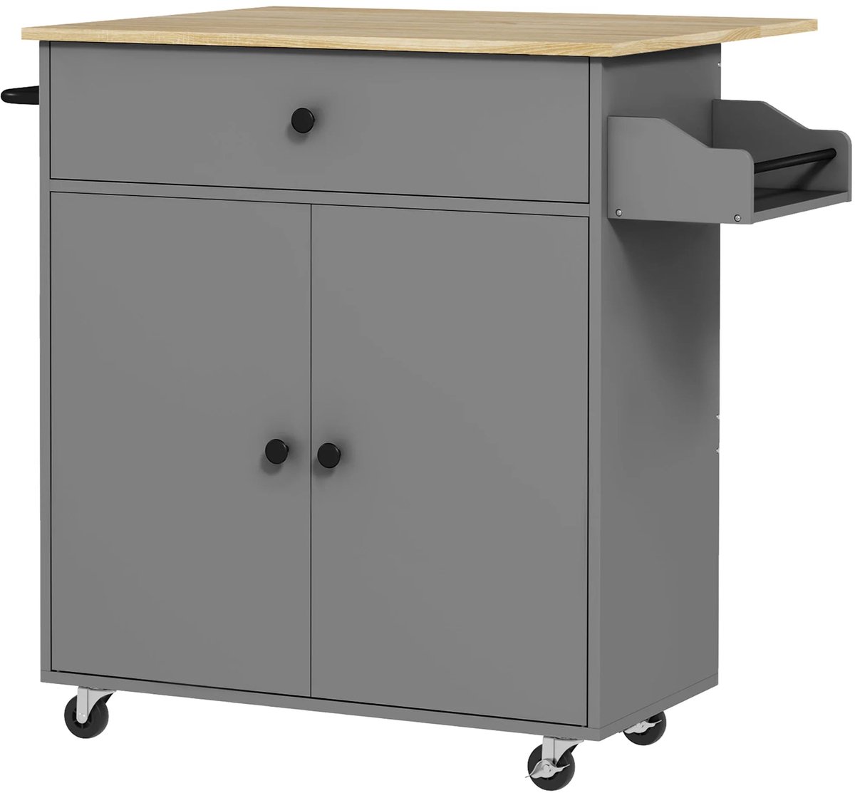 Keukeneiland – Keukentrolley – Kookeiland – Keukenkast – Serveerwagen – Inklapbaar Werkblad – Met Wieltjes En Opbergruimte – Grijs en Eiken