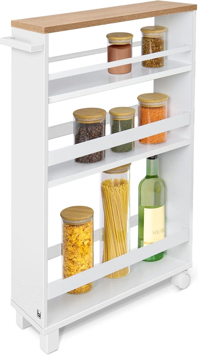 Plaats in smalle ruimtes: Dankzij het slanke ontwerp is deze keukentrolley ideaal voor tussenkasten, naast de koelkast of in een hoek van de keuken.
