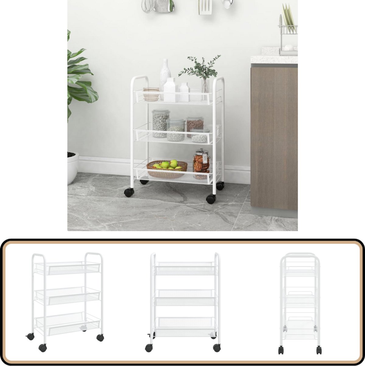 Organiseer uw keuken met de vidaXL 3-laags keukentrolley Breng stijl en functionaliteit samen met de vidaXL keukentrolley. Dit praktische meubelstuk is ideaal voor het maximaliseren van uw keukenruimte terwijl het een moderne uitstraling behoudt. Met zijn duurzame ijzeren constructie en witte afwerking past deze keukentrolley perfect in elke keukeninrichting.