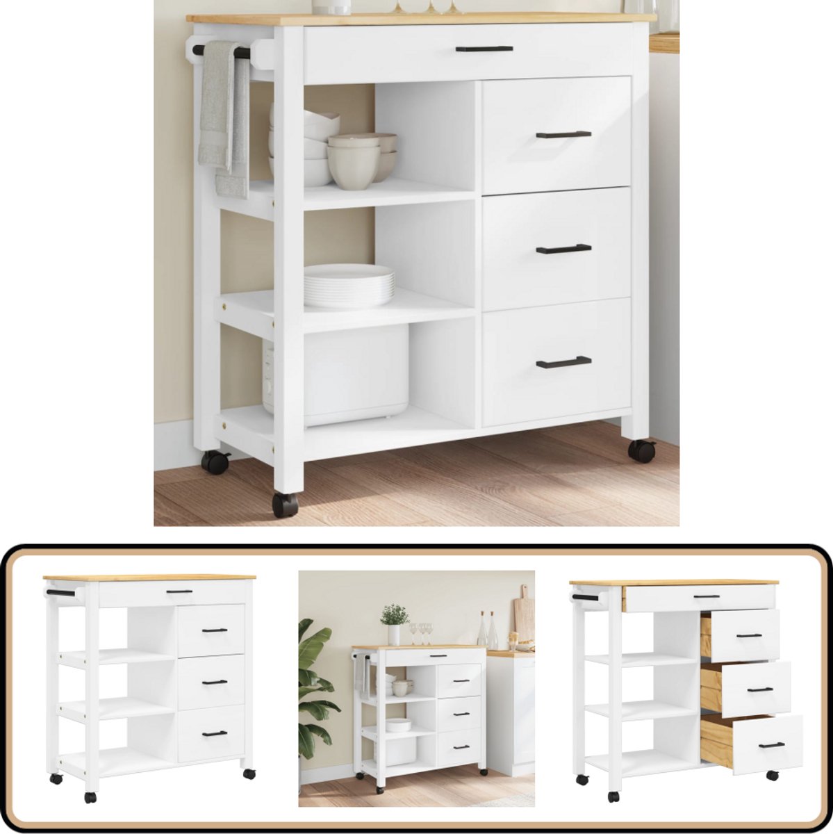 Stijlvolle en Praktische Keukentrolley De vidaXL Keukentrolley MONZA combineert functionaliteit met stijl. Gemaakt van massief grenenhout en bewerkt hout, is deze keukentrolley een duurzame en aantrekkelijke toevoeging aan elke keuken. Met zijn moderne ontwerp in wit en honingwas past hij perfect in zowel klassieke als moderne interieurs.