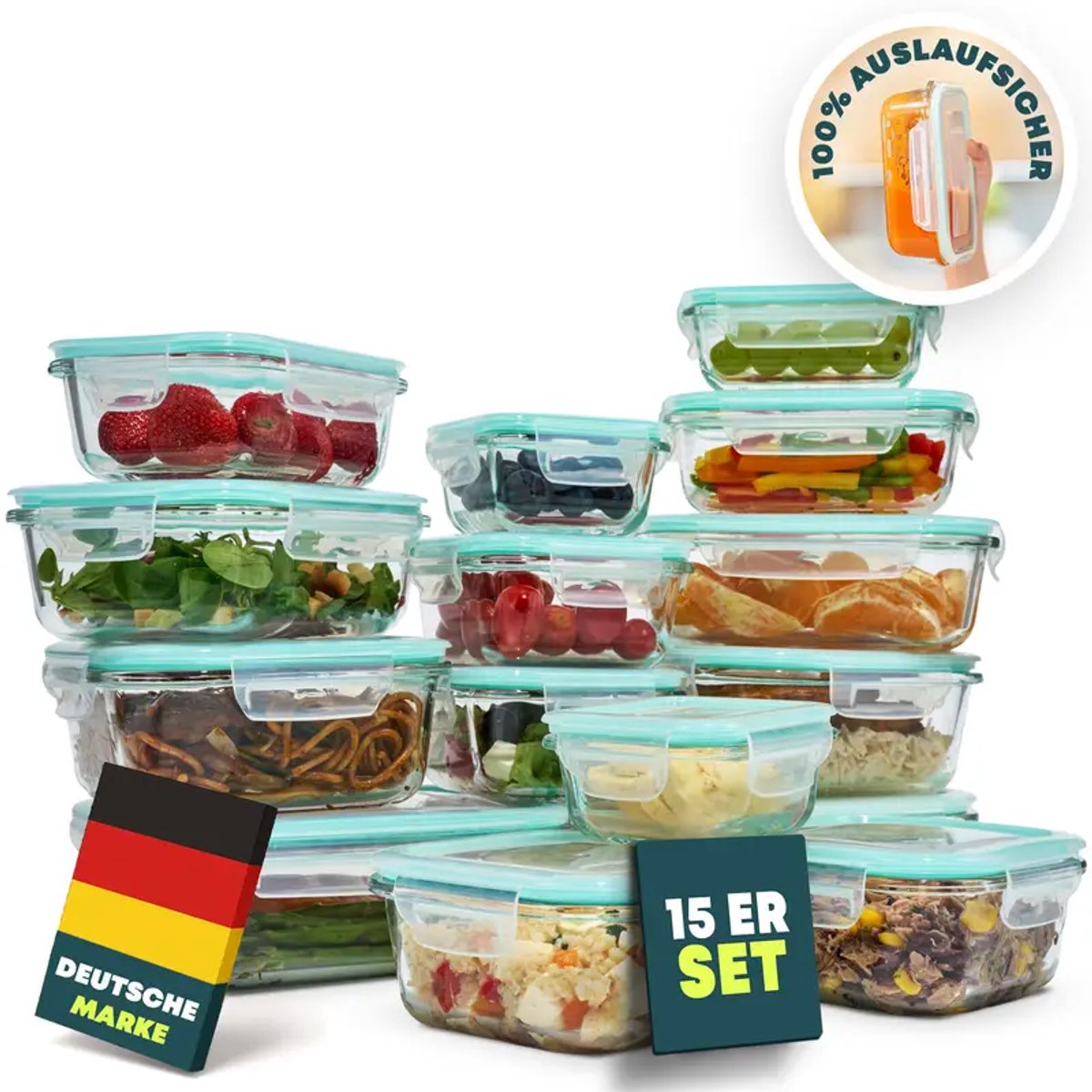 15-delige set glazen bewaarbakjes met lekvrije deksels