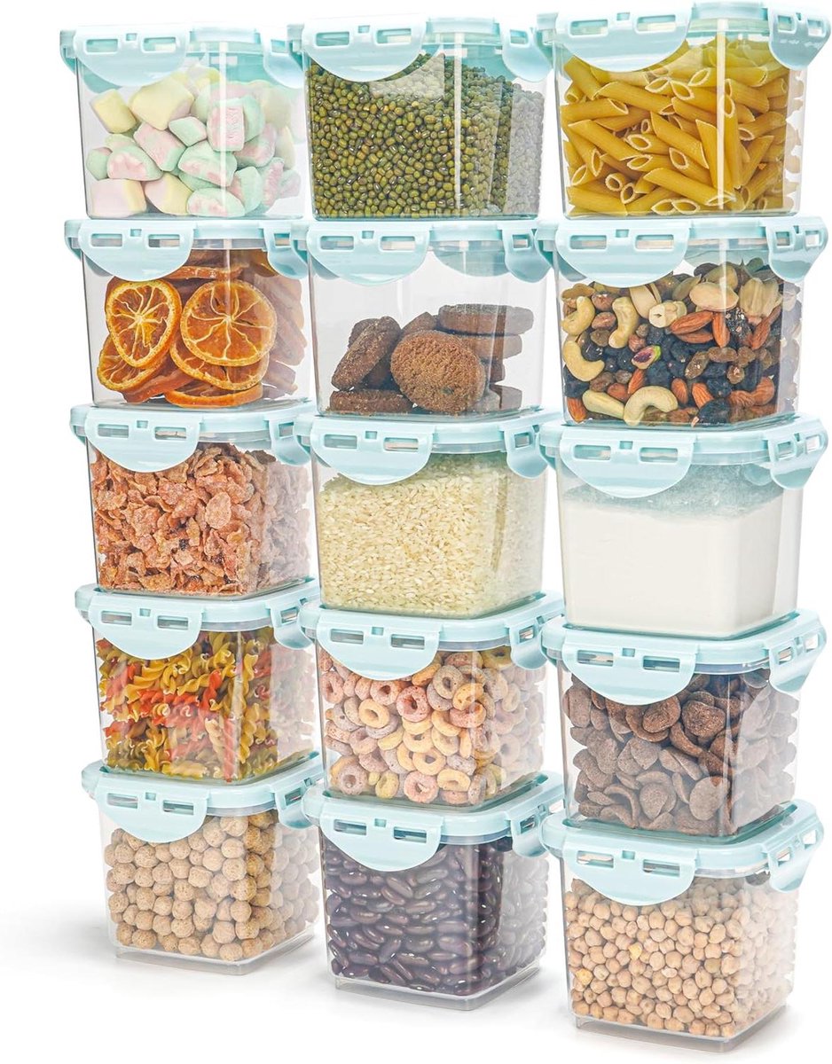 “`html VOEDSELOPBERGSET: Houd je kast of koelkast thuis georganiseerd met deze set van 15 doorzichtige kunststof voedselopbergcontainers. Elke container meet 11 x 10 cm en kan tot 650 ml bevatten. De vierkante bakjes hebben blauwe afsluitdeksels.