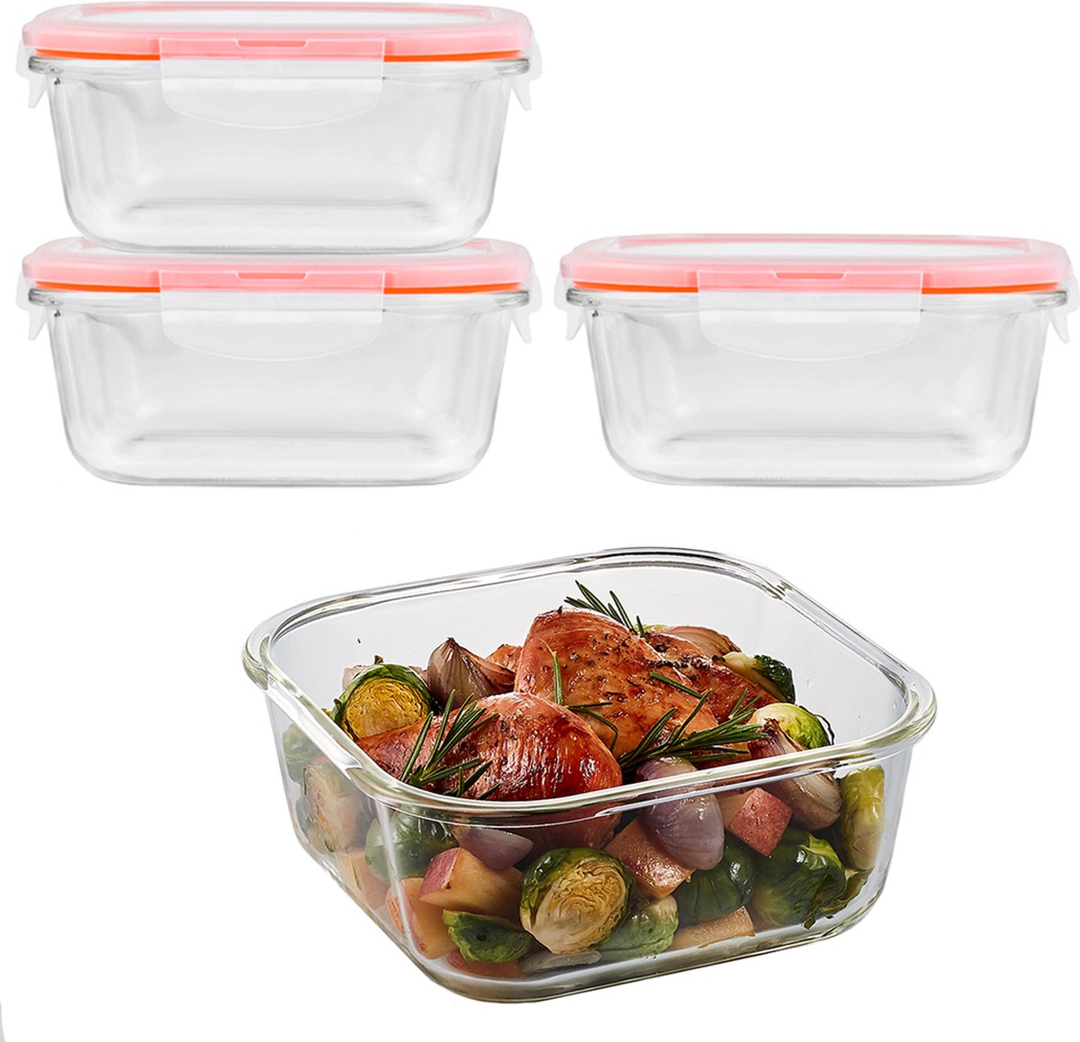 Lock&Lock Glazen vershoudbakjes – Glazen meal prep bakjes – Glazen bakjes met deksel – Ovenschaaltjes met deksel – Airfryer bakjes – Bewaarbakjes – Vershoudbakjes glas – Luchtdicht – Vierkant – 1.4 liter – Set van 4 stuks – LocknLock