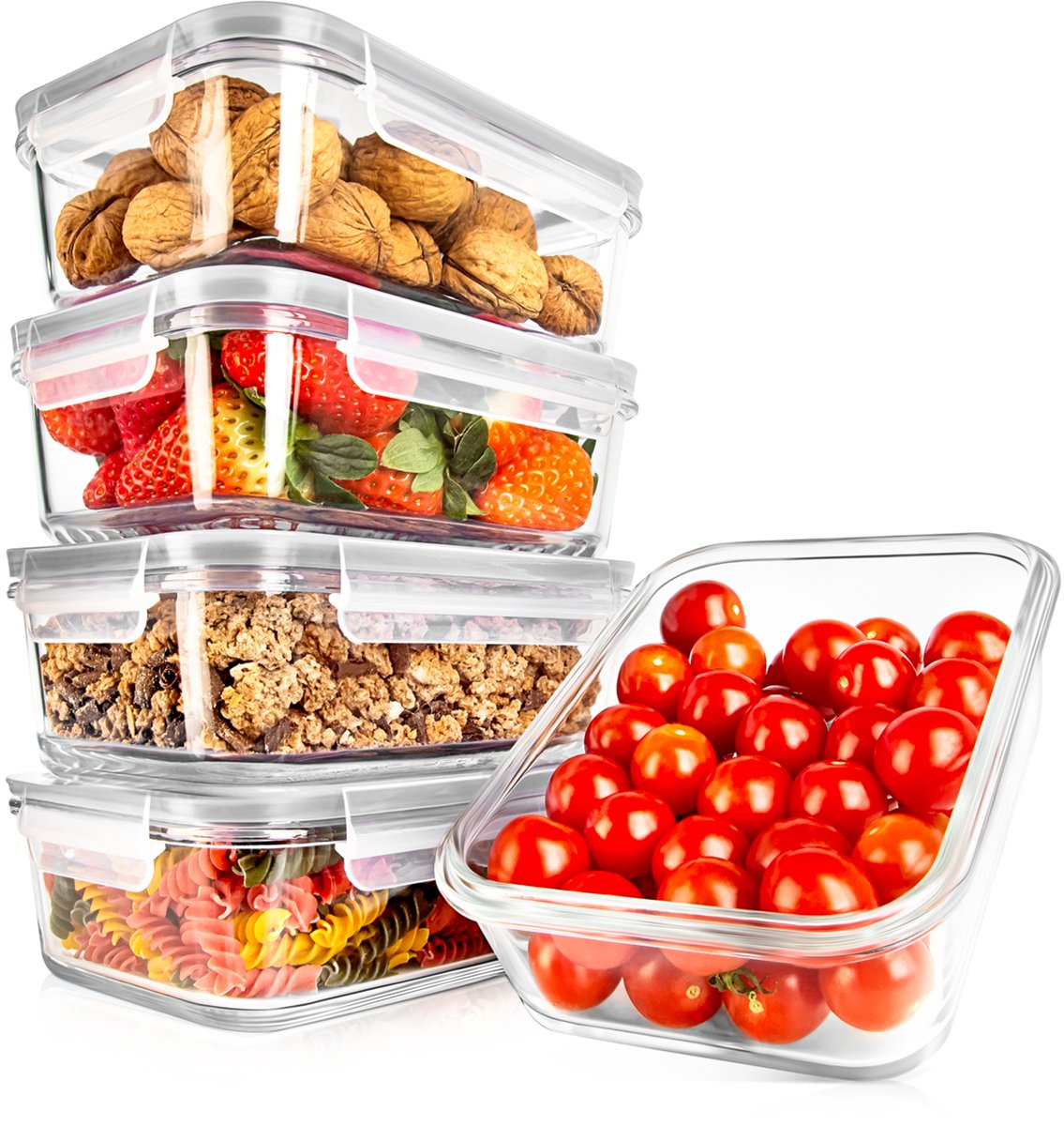 Deze NutriChef glazen voedselcontainerset bestaat uit 5 herbruikbare meal-prep containers met bijpassende klikdeksels. De containers zijn luchtdicht, BPA-vrij en geschikt voor oven, magnetron en vriezer, ideaal voor voedselopslag, meal prep en restjes.