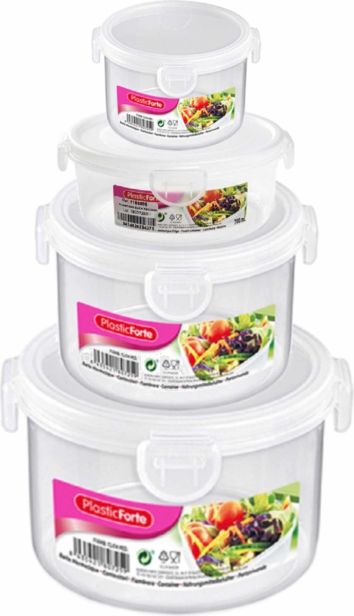 Set van 8x stuks ronde diepvries vershoudbakje met stevige deksel in 4x verschillende formaten. Voorraadbakjes/vershoudbakjes voor het bewaren van voedsel. Handige bewaarbakjes. De voedsel bewaarbakjes kunnen hermetisch (luchtdicht) afgesloten worden, waardoor de voedingsmiddelen langer vers blijven. Gemaakt van stevig plastic. Geschikt voor in de magnetron, koelkast/vriezer en vaatwasmachine. De set bestaat uit: