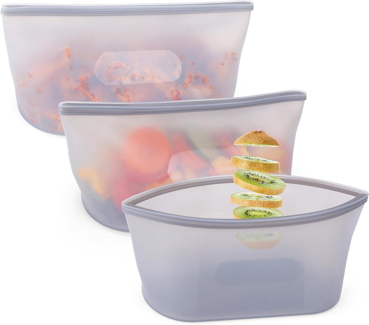 “`html Deze set van 3 herbruikbare siliconen voedselcontainers is het perfecte accessoire voor in de keuken. De bakjes meten elk 23 x 9,5 cm met een inhoud van 750 ml en zijn voorzien van goed sluitende ritsen.