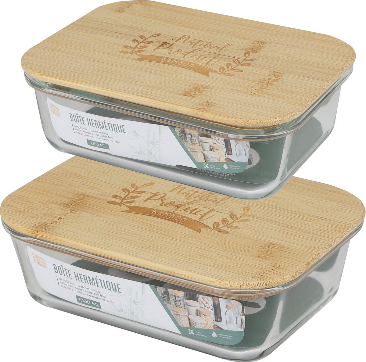 Voedsel bewaarbakje/vershoudbakje – 2x -bamboe deksel – 1500 en 1000 ml – ovenbestendig