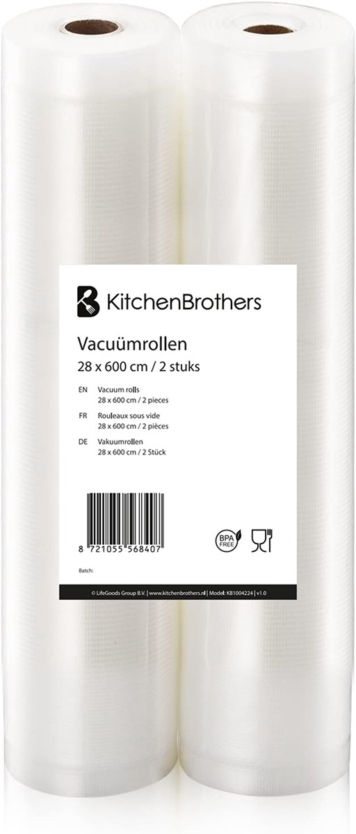 Houd je eten langer vers en smaakvol met de KitchenBrothers Vacumeerrollen 28x600cm (2 stuks). Deze set van twee extra lange rollen is de ideale uitbreiding voor jouw keuken. Of je nu een hele vis wilt invriezen, kleine porties kruiden wilt bewaren of aan de slag gaat met sous-vide koken: met deze rollen bepaal je zelf de lengte. Ze zijn ontworpen om universeel te werken, dus ze passen perfect in jouw KitchenBrothers apparaat en andere gangbare vacumeermachines.