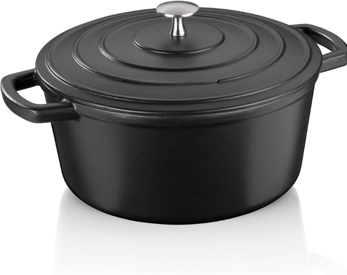 Braadpan Met Deksel – Gietijzer – Emaille Coating – Hoge Warmte-Opslag – Geschikt Voor Inductie – 5 Liter – Rond – Zwart