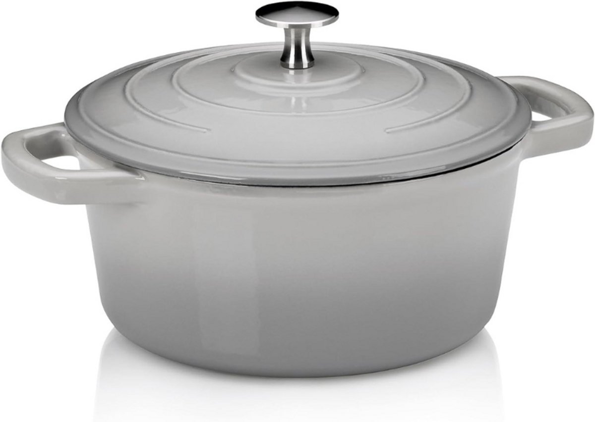 Braadpan Met Deksel – Gietijzer Met Laagje Email – Hoge Warmte-Opslag – Geschikt Voor Inductiekookplaten – 2,5 L – Grijs – Rond