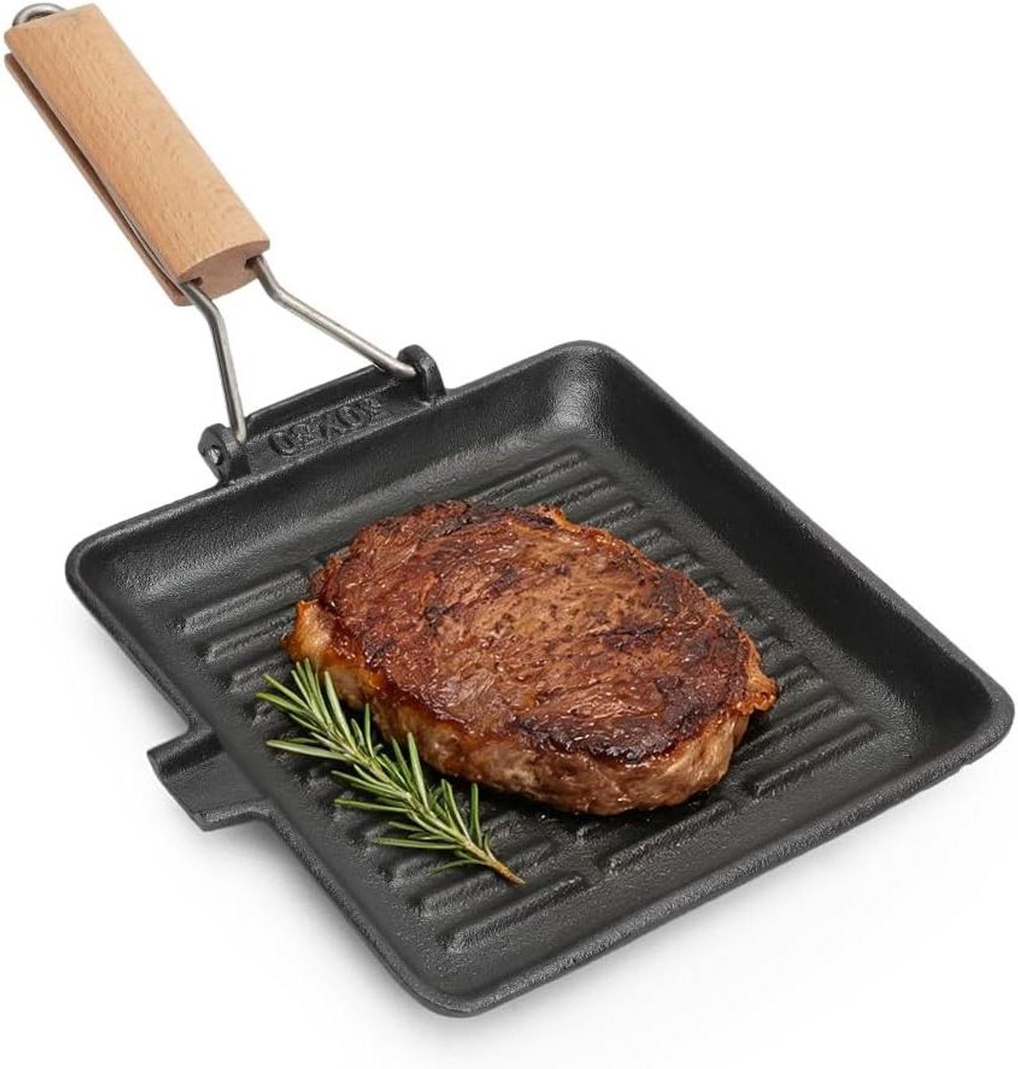 Gietijzeren grillpan met inklapbare houten handgreep, vierkante steakpan voor gasgrill en ovenbereiding