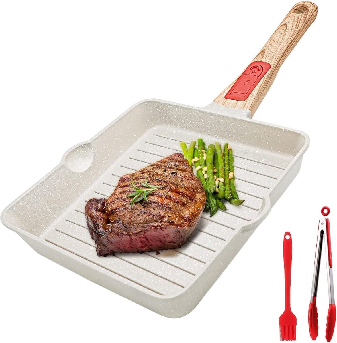 Grillpan, 20 x 20 cm, met afneembare handgreep, aluminium steakpan, anti-aanbaklaag, geschikt voor vaatwasser en oven (wit) - Kookstore.nl