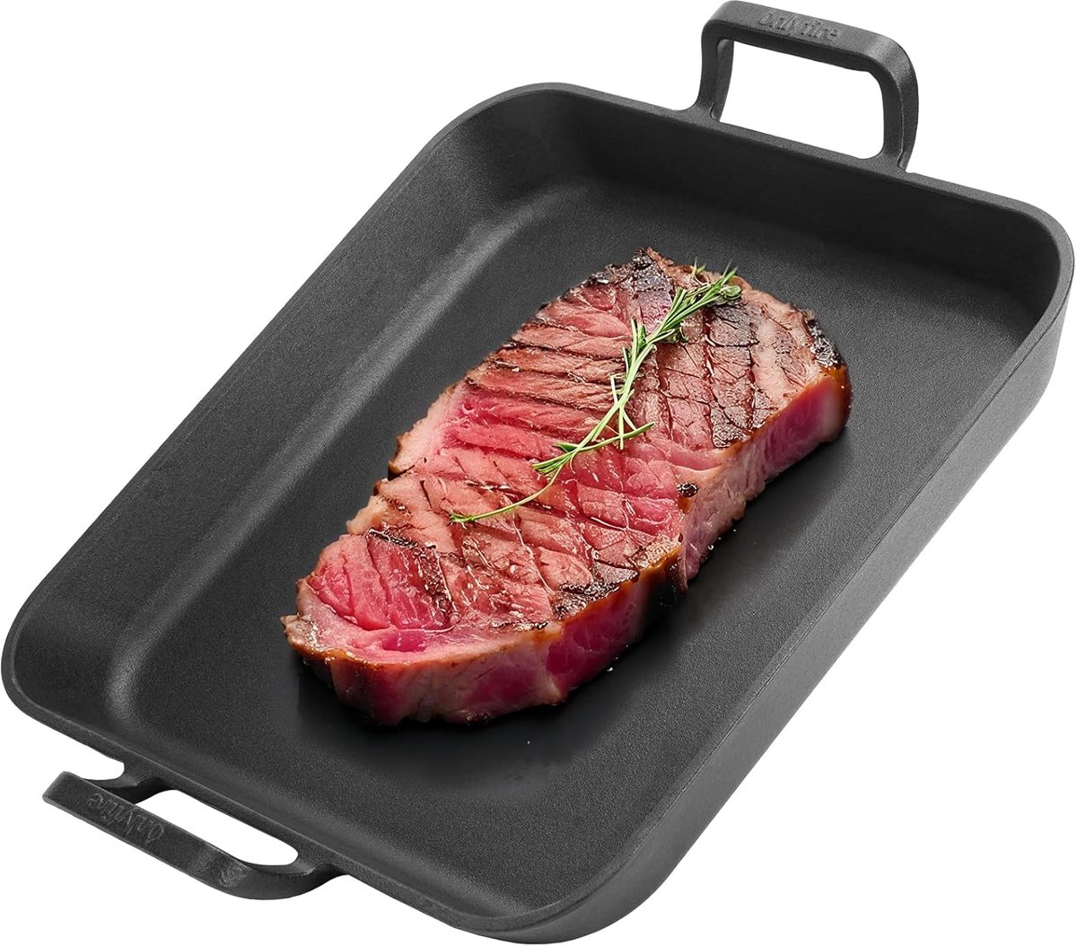 Compacte grillpan met handgrepen: de grillpan met comfortabele handgrepen biedt een betere grip en vergemakkelijkt de overdracht van gerechten van de grill naar de tafel.