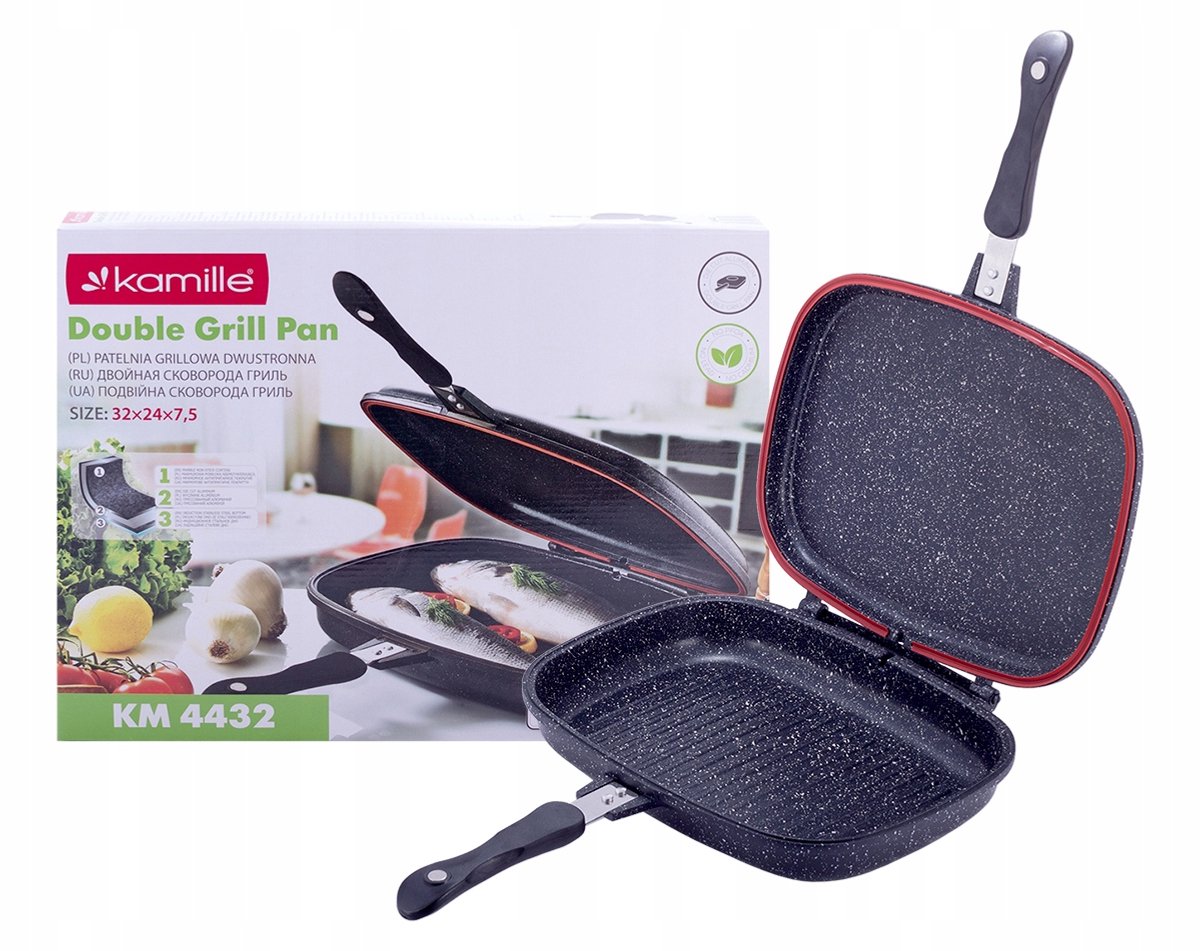 Bereid uw favoriete gerechten snel en gezond met deze dubbelzijdige grillpan van Kamille. De pan is ideaal voor grillen en bakken, en zorgt voor gelijkmatig gegaarde gerechten dankzij de sterke magneet in het handvat. De siliconen afdichting voorkomt geur- en rookontwikkeling. Het ergonomische, niet-verwarmende handvat biedt comfort tijdens het koken. Deze pan is geschikt voor alle soorten kookplaten, inclusief inductie, en mag in de vaatwasser.