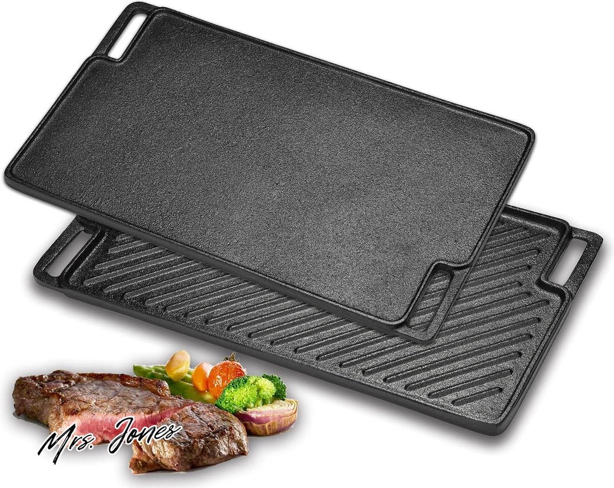 Home Pannen Bakken Grillpannen Mrs. Jones Gietijzeren grillpan dubbelzijdig bruikbaar voor gasfornuizen en elektrische grill – barbecue camping tuin – 455 x 26 cm .