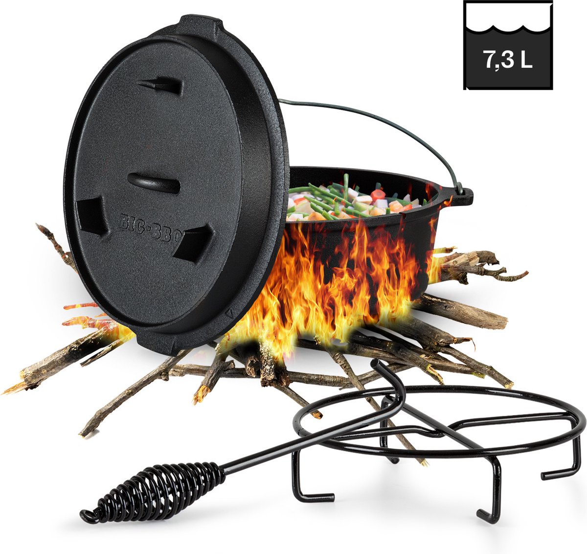 Altijd een heet ijzer op het vuur: De Guernsey BBQ Dutch Oven van Klarstein kan universeel worden gebruikt voor koken, smoren, braden, bakken en frituren en kan met briketten, de gloed van een kampvuur of als pan op de barbecue worden verwarmd. De rustieke allrounder is al ingebrand, klaar om te koken. De vervaardiging van gietijzer zorgt daarbij voor een optimale warmteverdeling. De praktische deksel met hoge rand is geschikt om te braden of te serveren en kan gemakkelijk op de bijgeleverde standaard worden gelegd. Voor gebruik bij het kampvuur is de Guernsey Premium Dutch Oven ook met pootjes aan de pan verkrijgbaar.