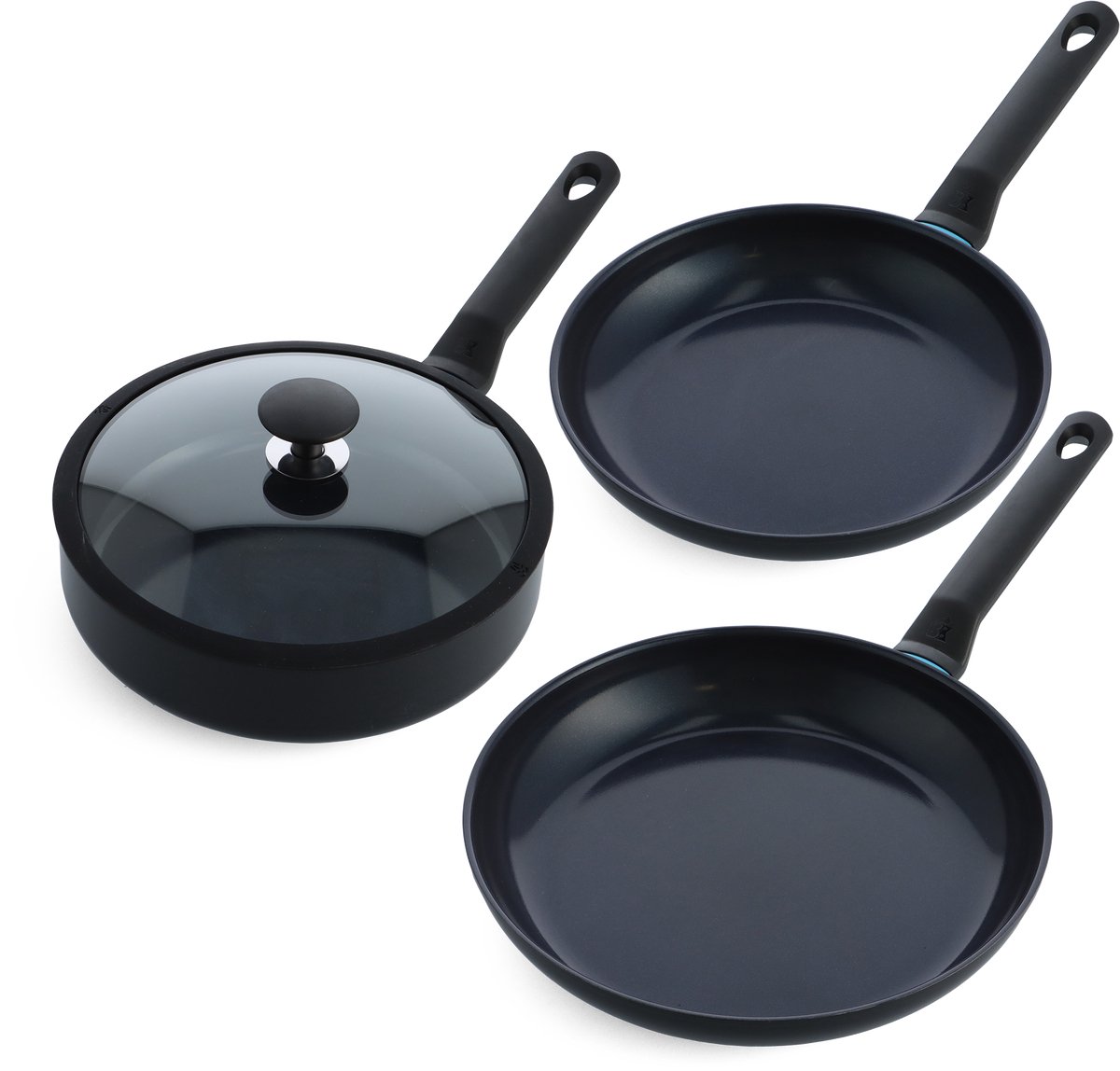 BK Blue Label Induction 3-delige pannenset - Koekenpan 24/28cm - Hapjespan met deksel 24cm - PFAS vrij - zwart- koelgrepen - ovenbestendig tot 160° - Kookstore.nl