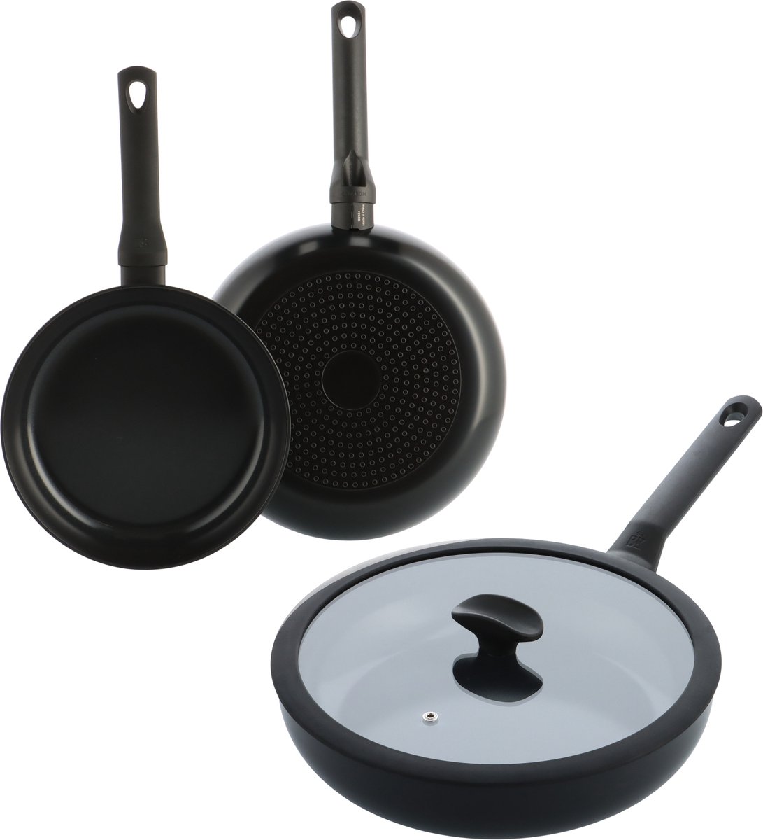 De pannen zijn gemaakt van stevig aluminium en hebben een PFAS-vrije keramische antiaanbaklaag. Koelblijvende grepen zorgen voor extra gebruiksgemak.