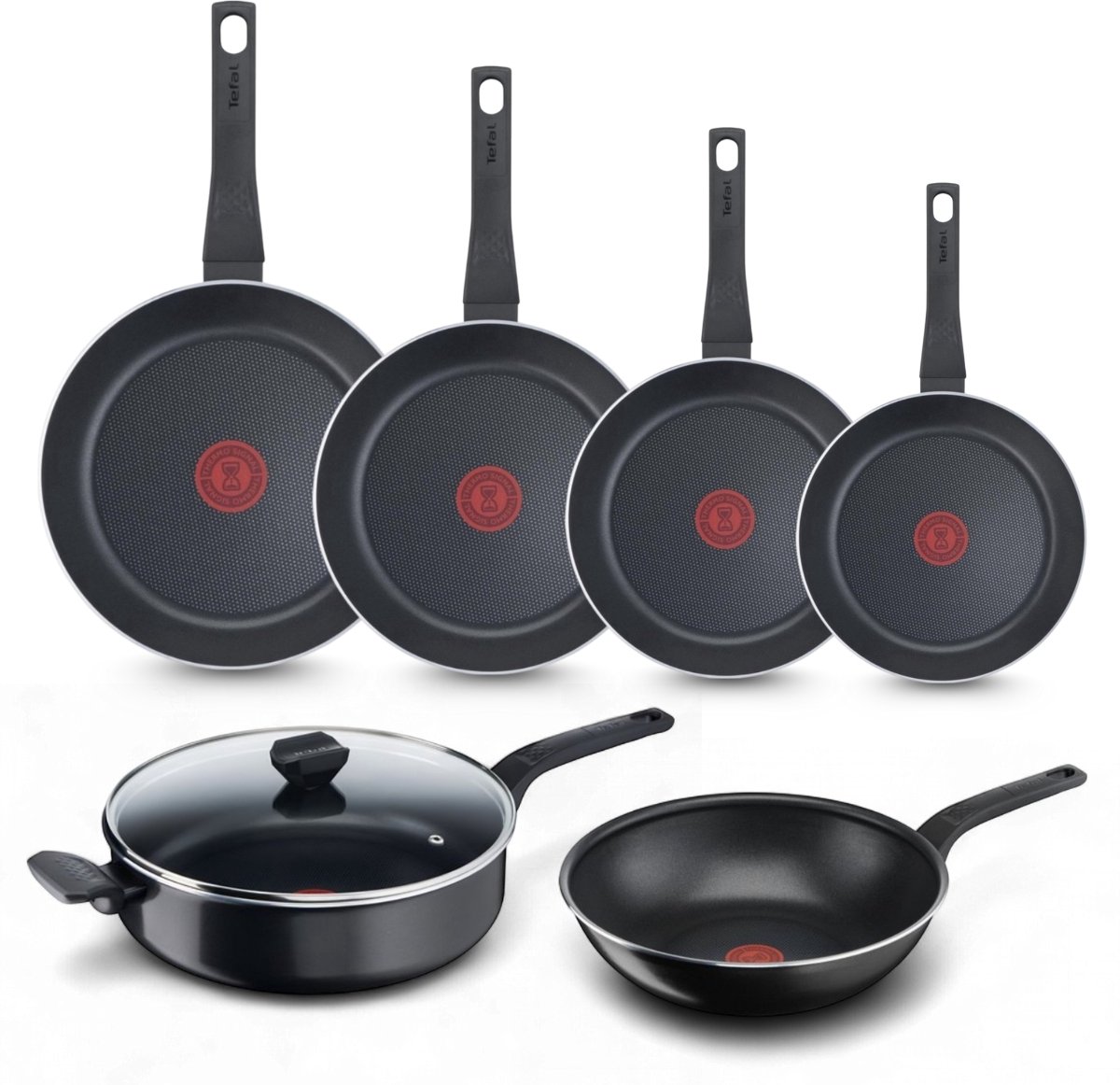 Tefal Easy Cook & Clean Pannenset – Koekenpannen 20/24/28/32cm + Wokpan 28cm + Hapjespan 28cm – Niet geschikt voor Inductie – Anti-aanbaklaag – Aluminium – Zwart Maak koken eenvoudiger en efficiënter met de Tefal Easy Cook & Clean Pannenset. Deze uitgebreide set bestaat uit drie koekenpannen, een wokpan en een hapjespan, ideaal voor dagelijks gebruik. Dankzij de duurzame anti-aanbaklaag en de innovatieve Thermo-Signal™ technologie bereid je moeiteloos de lekkerste gerechten en maak je de pannen eenvoudig schoon.