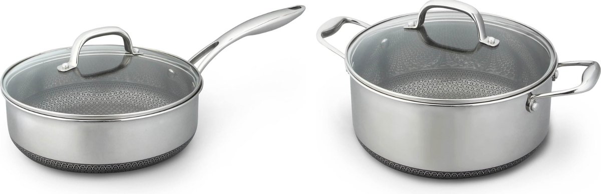 De pannen zijn gemaakt met een Try-ply constructie van hoogwaardig materiaal dat warmte snel en gelijkmatig verdeelt, wat resulteert in een perfecte garing van je gerechten. De pannen beschikken over een antiaanbaklaag, waardoor het eten niet vast blijft zitten en de pannen gemakkelijk schoon te maken zijn. Ook zijn de pannen voorzien coating zodat de anti-aanbaklaag niet beschadigd, zelfs als je met metalen kookgerei kookt.