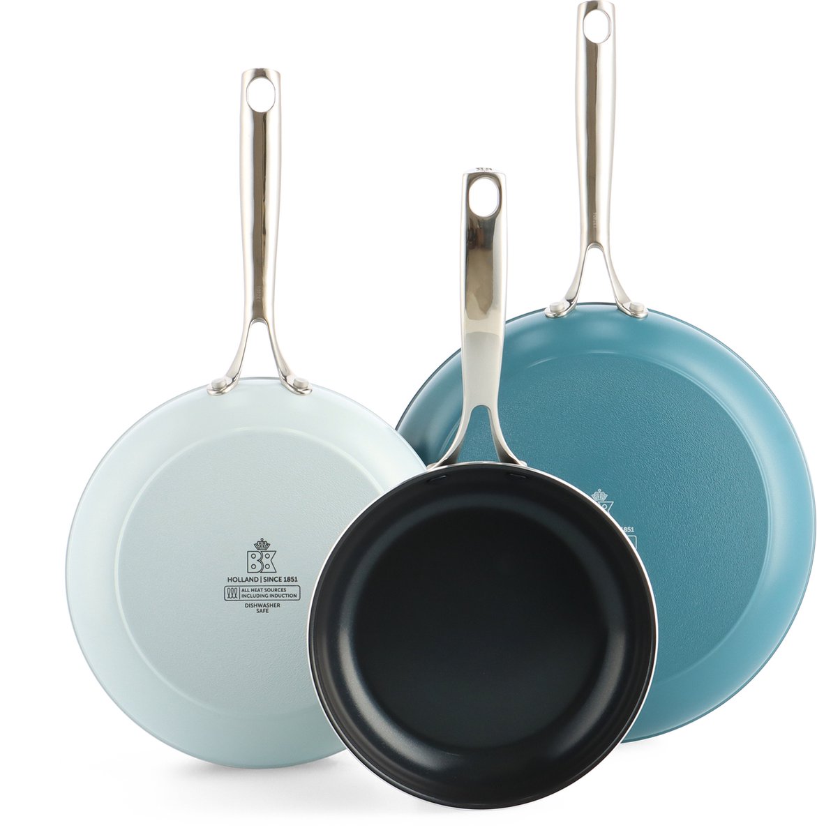 BK Sky Blue keramische inductie koekenpannenset 3 delig – Ø20/24/28cm – PFAS vrij – Inductie pannenset – Inductie koekenpan – Ovenbestendig tot 220°C – Vaatwasserbestendig – Snelle opwarming – RVS handgrepen – Blauw