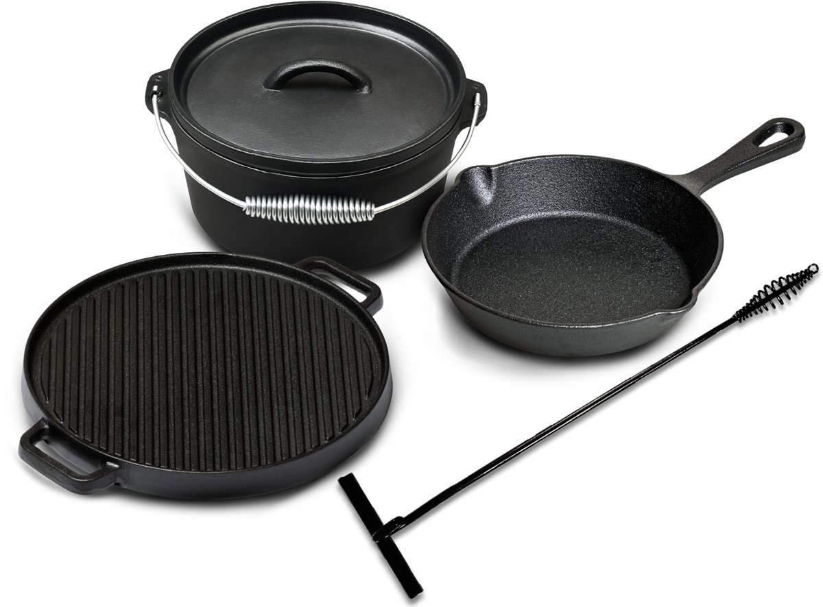 Blackwell Dutch Oven BBQ set Gietijzer – Braadpan + Lifter, Koekenpan ø 20 cm & Grillplaat ø 30 cm – 4 Delig