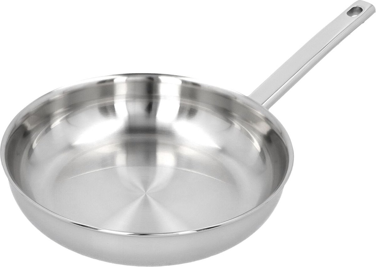 De knappe roestvrijstalen Ecoline 5 koekenpan van 24 cm is heerlijk om mee te werken en geeft mooie resultaten. Ze ligt goed in de hand en werd tot aan de rand opgebouwd uit 5-lagenmateriaal. Die solide combinatie van legeringen verdeelt de warmte goed zodat je gelijkmatig en gecontroleerd kunt bakken. Zelfs op een lage stand. Of je nu kotelet, tonijnsteak of kippenfilet bereidt, in deze pan bak je alles mooi gelijkmatig aan. De binnenkant blijft lekker mals en de smaak komt optimaal tot zijn recht. De kleine aanbaksels kun je deglaceren voor een rijke saus. Ook aardappeltjes geef je snel en goed een krokant korstje, in een mix van boter en olie. Deze Ecoline 5 koekenpan is geschikt voor alle kookplaten, inclusief inductie. Zodra de pan voldoende opgewarmd is, kun je het fornuis een stand lager zetten. De juiste baktemperatuur wordt behouden, waardoor je energie bespaart. Durf je al eens met mes en vork in een pan te zitten? Geen stress, dit exemplaar uit onze Ecoline 5 serie kan ertegen. Nog een voordeel: de stevige, gelaste steel blijft lang koel. Meer dan degelijk, efficiënt en aangenaam in gebruik. Topdeal qua prijs-kwaliteit!