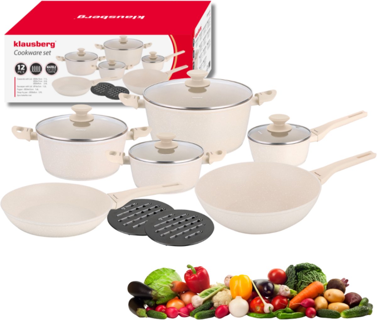 Klausberg KB-7959 Pannenset 12 Delig Beige | Marmer Anti-aanbaklaag | Inclusief Koekenpan en Wok | Geschikt voor Inductie | Cremewit