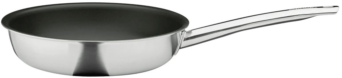 De roestvrijstalen handgreep is hol van binnen, waardoor deze tijdens normaal gebruik koel genoeg blijft om met de hand vast te pakken. Na gebruik mag de pan in de vaatwasser – dit wordt zelfs door de fabrikant aanbevolen.