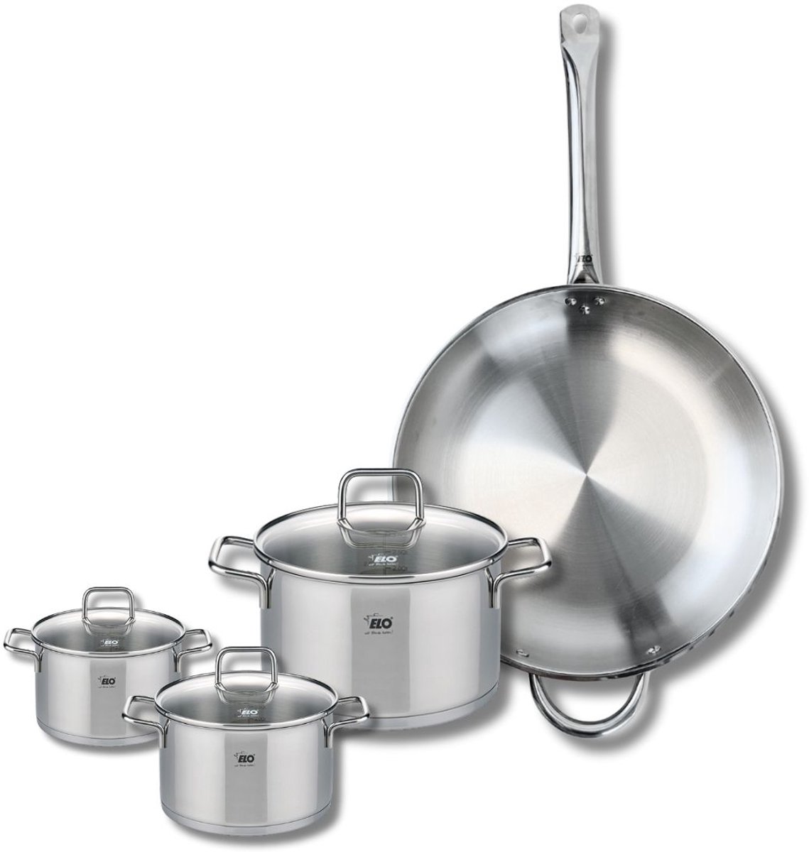 BESCHRIJVING: Deze ELO PFAS-vrije kookgereiset bestaat uit een 32 cm 18/10 roestvrijstalen koekenpan en 3 steelpannen met glazen deksels in verschillende maten (12 cm, 16 cm en 20 cm), om aan al uw kookbehoeften te voldoen.