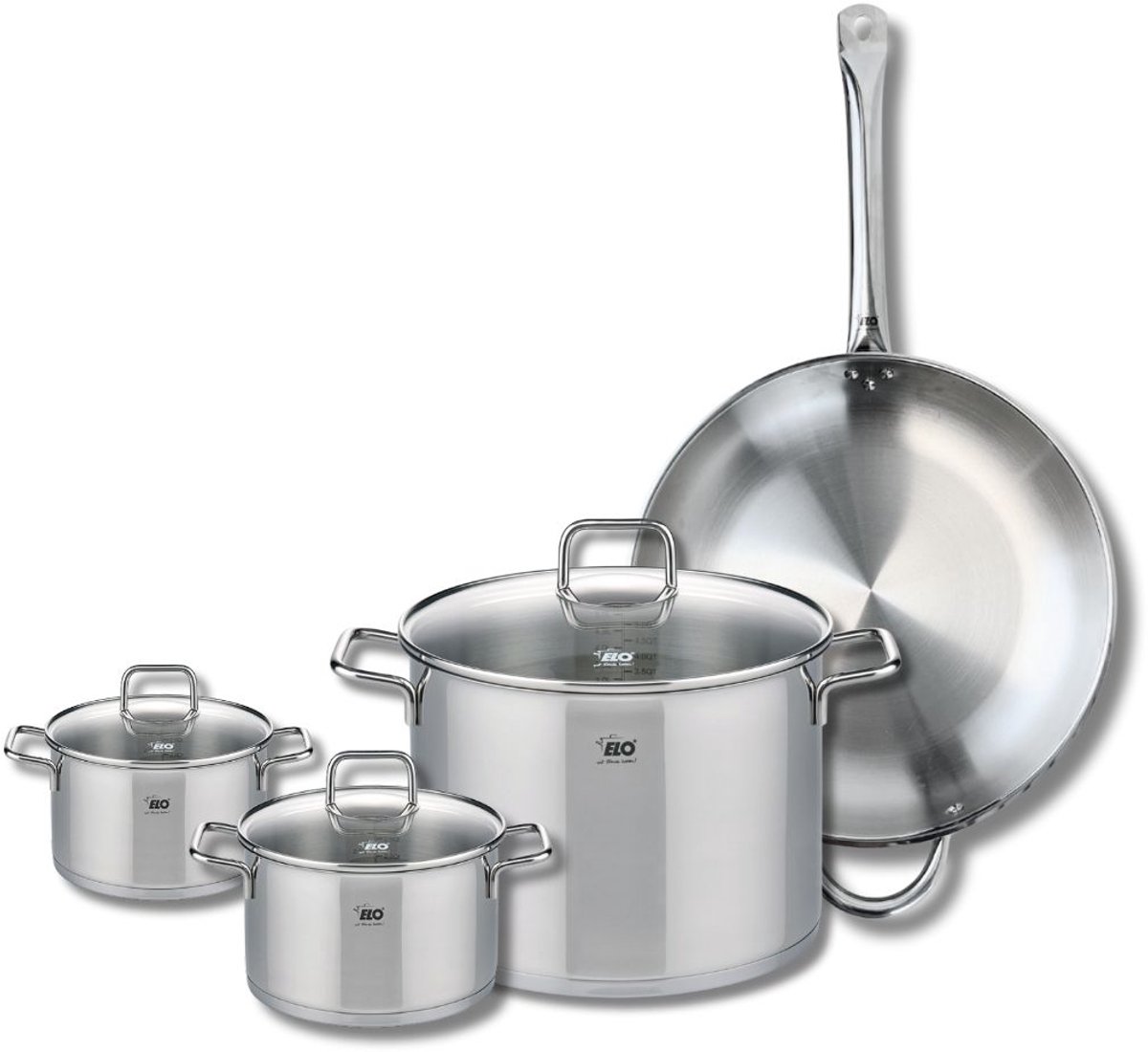 Ontdek onze PFAS-vrije roestvrijstalen kookset, een onmisbare collectie voor alle kookliefhebbers. Deze set bevat een koekenpan van 32 cm en drie steelpannen met glazen deksels in verschillende maten: 14 cm, 26 cm en 26 cm, allemaal ontworpen door het gerenommeerde kwaliteitsmerk ELO.