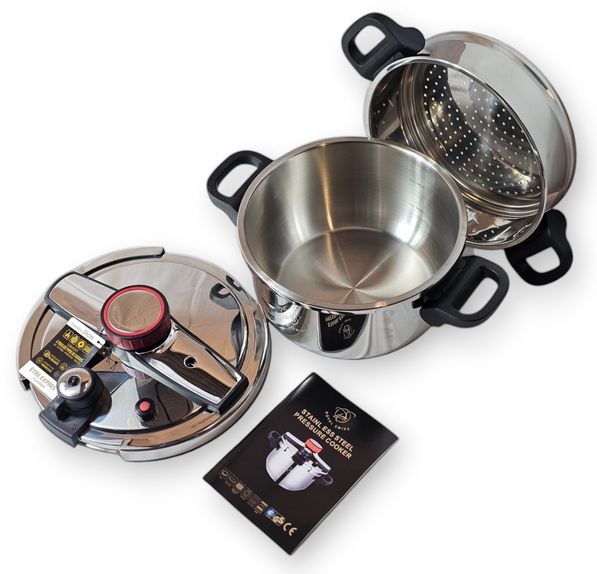 Inclusief Stoommandje en Glazen Deksel De Royal Swiss snelkookpan wordt geleverd met een handig stoommandje, perfect voor groenten, vis of andere gerechten die je wilt stomen. Het glazen deksel maakt het eenvoudig om het kookproces in de gaten te houden zonder de pan te openen, zodat druk en smaak behouden blijven.
