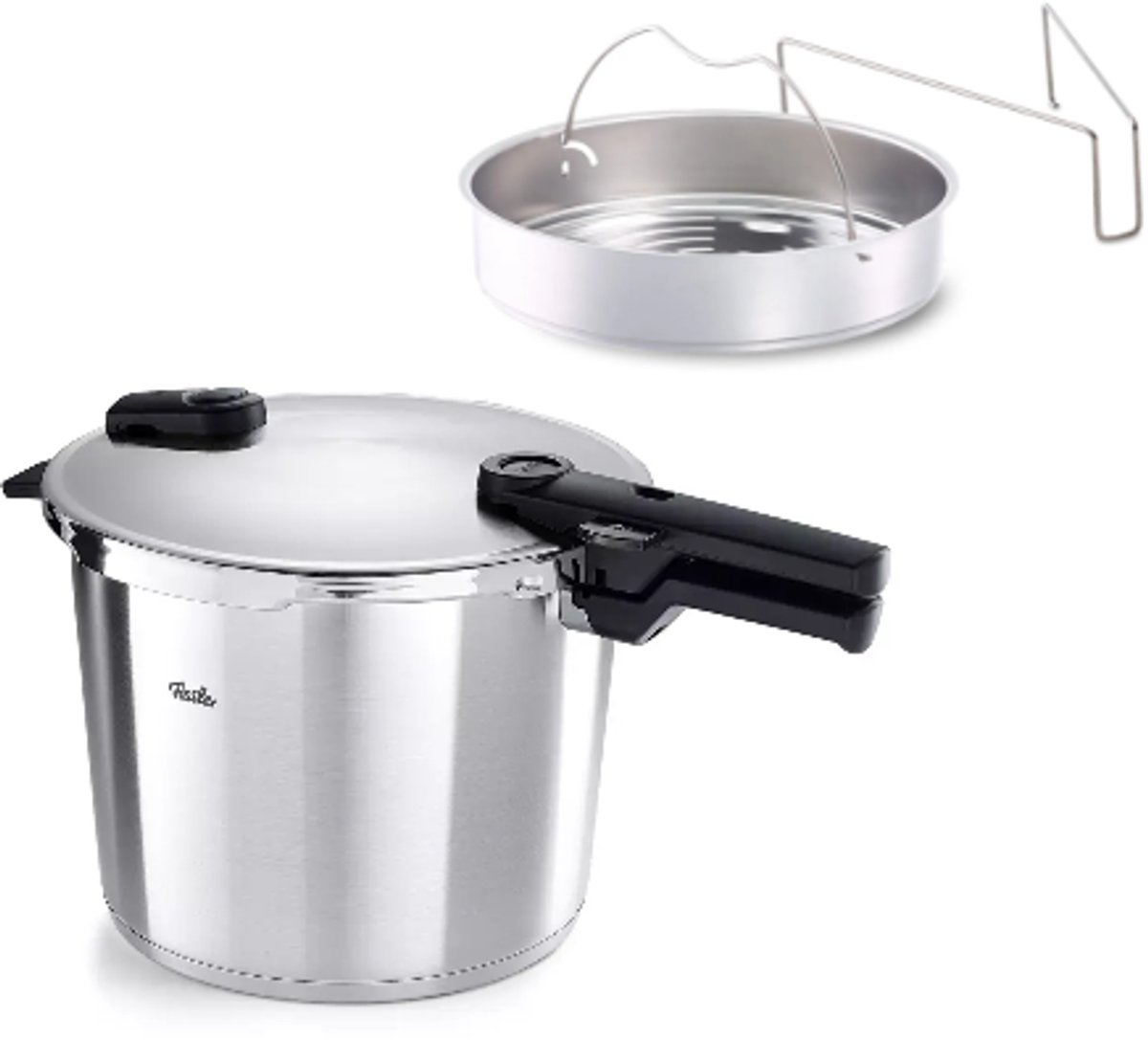Fissler Snelkookpan – hogedrukpan – met stoominzet en driepoot – 10liter – Vitaquick Premium Fissler