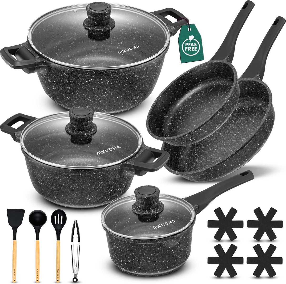 Awudha - Pannenset 16-delig Inductie & Gas - PFAS-vrij - Koudgrepen - met Glazen Deksels - Koekenpan, Steelpan & Kookpannen - Aluminium - Zwart - Kookstore.nl