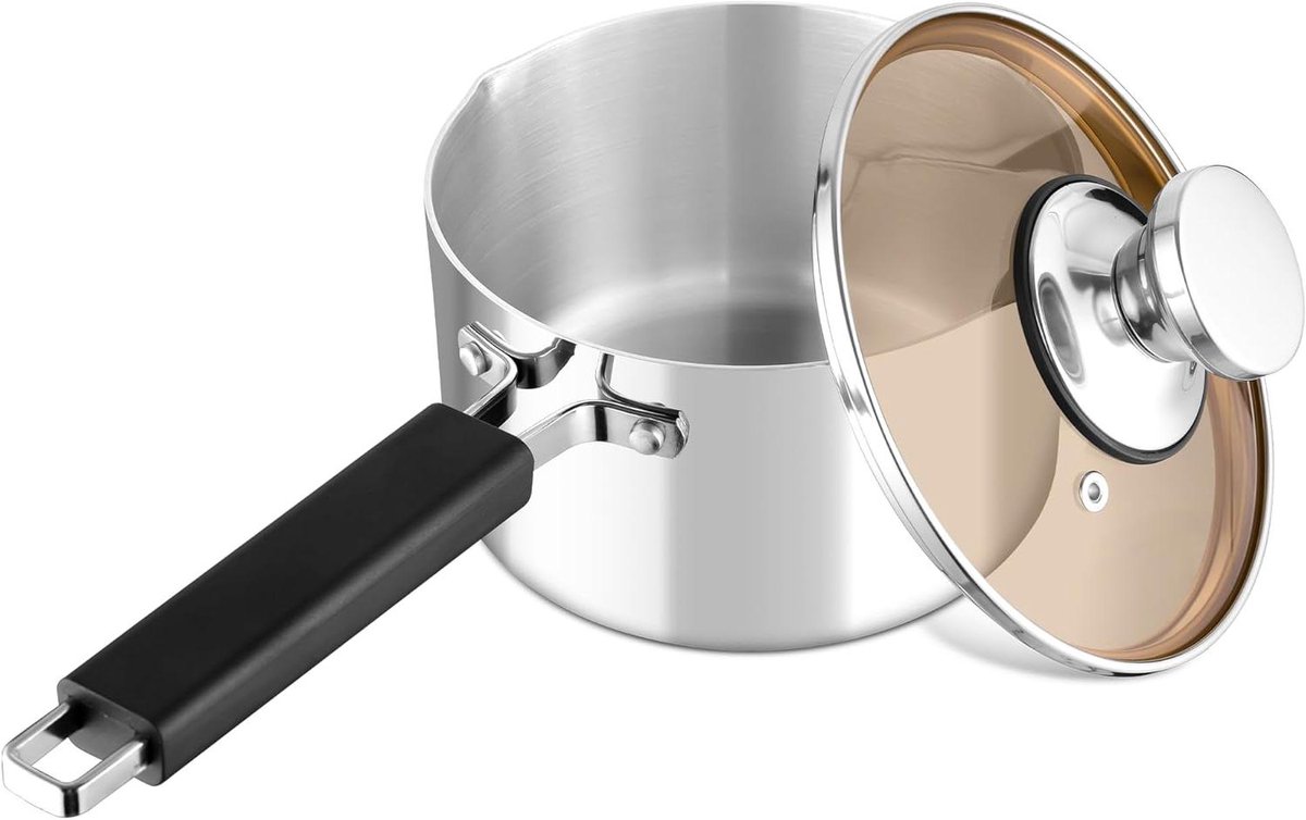 CSGoods – Roestvrijstalen Steelpan 16 cm 3-laags Melkkan met Glazen Deksel 1,9 l – Inductie Geschikt – Niet Giftig – Hoogglans Gepolijst