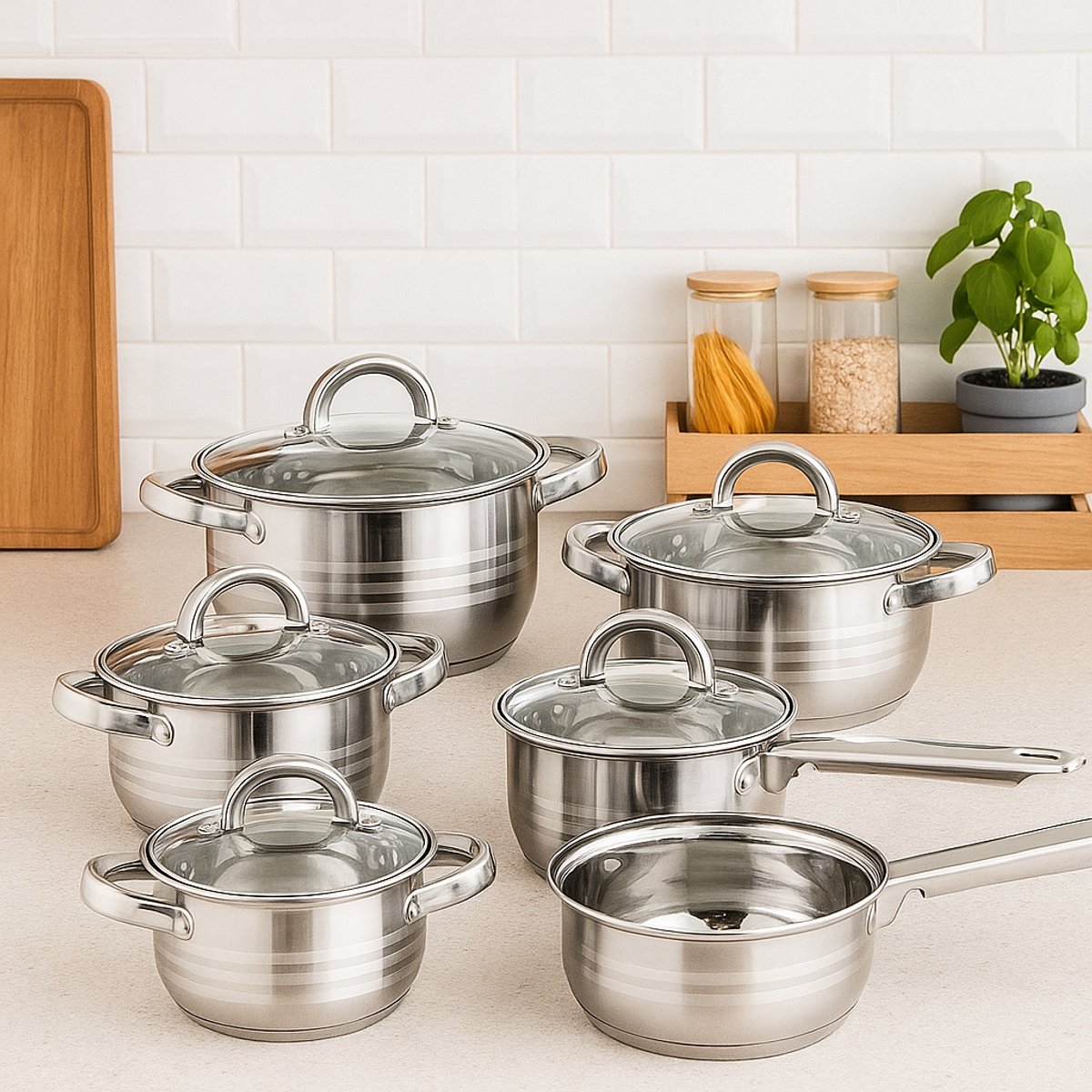 Mevaz Pannenset - 12 Delig - RVS - Met Glazen Deksels - Steelpan - Koekenpan - Inducti- PFAS-vrij - Kookstore.nl