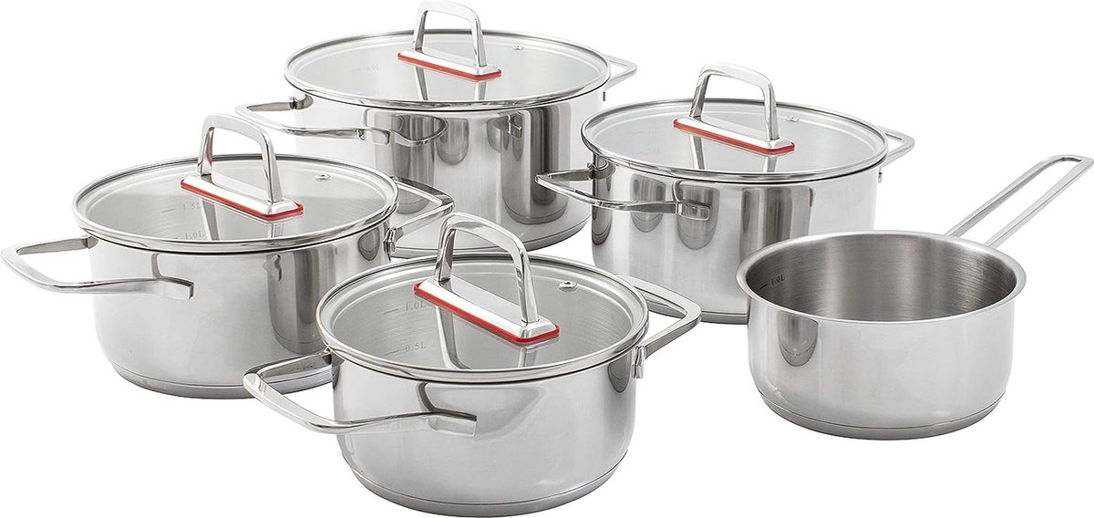 Inhoud levering: de 9-delige kookset omvat 4 kookpannen elk met glazen deksel: 16 cm/ 18 cm/ 20 cm/ 24 cm en een steelpan: 16 cm