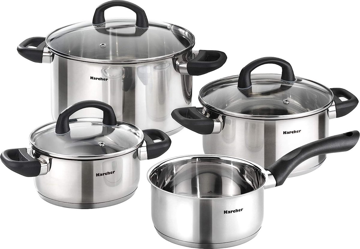 Samenstelling: steelpan (16 cm); 3x kookpannen met glazen deksel (16 cm, 20 cm, 24 cm)