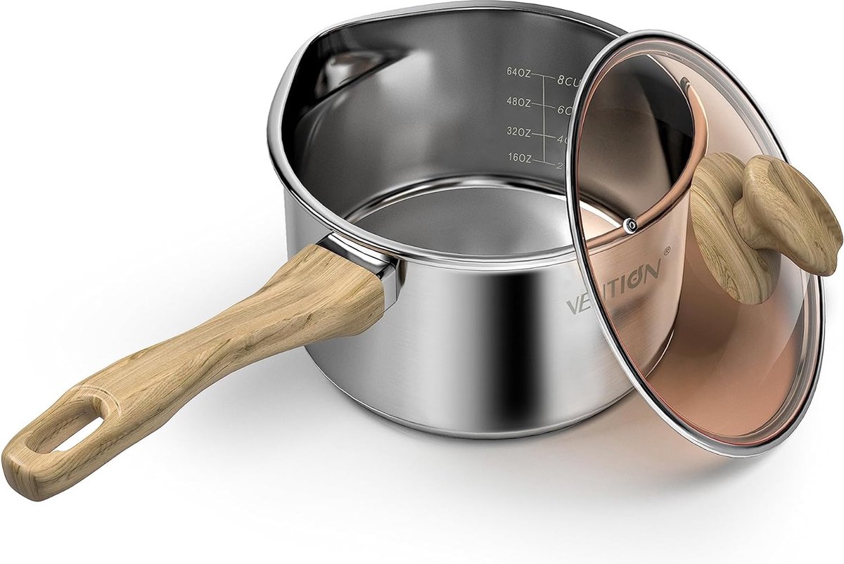 Geschikt voor alle warmtebronnen: inductie, elektrisch, gasfornuizen Gezond materiaal: gemaakt van 18/8 roestvrij staal in levensmiddelenkwaliteit. Duurzaam en robuust. Eenvoudig te reinigen en vaatwasmachinebestendig schenktuit en meetschaal: eenvoudig uitgieten van vloeistoffen en controleer de capaciteit goed Gelijkmatig verwarmd en comfortabel design: 3-laags composietmateriaal. Zichtbaar glazen deksel. Cool-Touch-handgreep. knop set lepel Gebruik voor: sauzen, soep, melk, snoep, boter, kleine porties eten