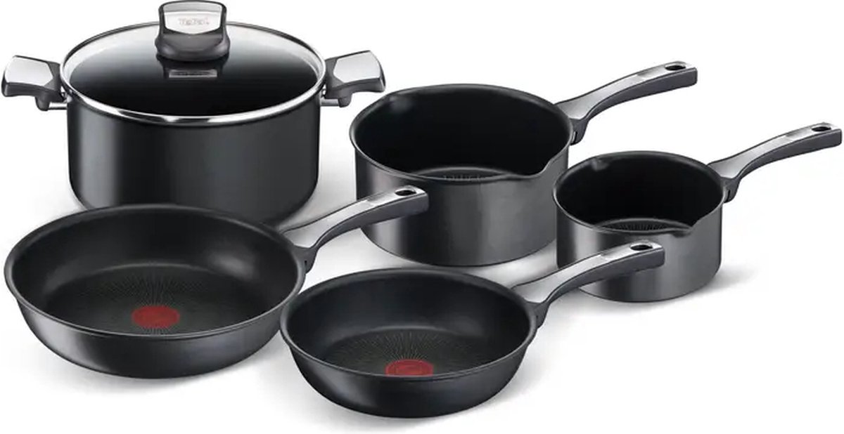 TEFAL 5 DELIGE SET! – TEFAL – PANNENSET – KOOKPANNENSET – TITANIUM ANTI AANBAKLAAG – ANTI SLIJTAGESET – KRASBESTENDIG – THERMO SIGNAL TECHNOLOGIE – THERMO FUSION – MUST HAVE – KOEKENPAN – STEELPAN – BRAADPAN – GLAZEN DEKSEL