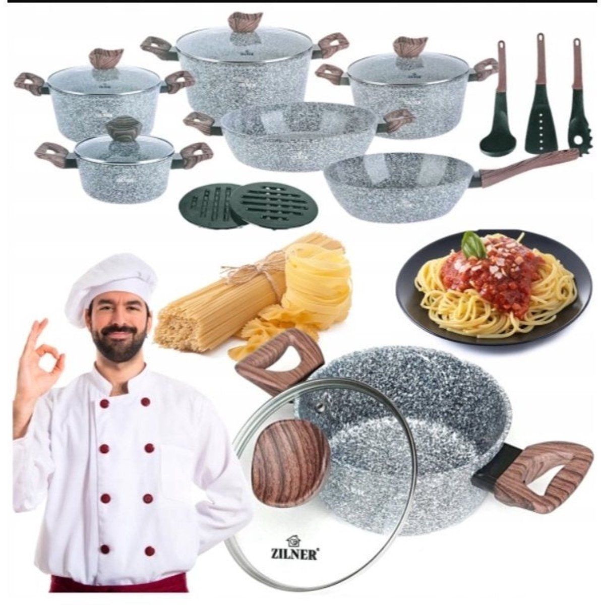 Set bevat o.a.: 2,3L, 4,3L, 6,5L kookpannen met deksels, 1,2L steelpan, 2,1L koekenpan, 3,2L wokpan, nylon keukenhulpmiddelen en hittebestendige schalen