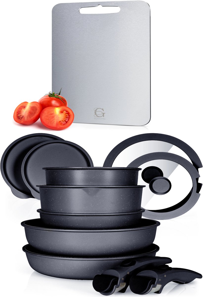 Glissimo Cookware – 16-delige Keramische Pannenset Zwart – Afneembare Handgreep – Non-stick – Pannenset -Geschikt voor alle warmtebronnen – PFAS vrij – BPA vrij -Anti Baklaag – Stapelbaar – RVS Snijplank