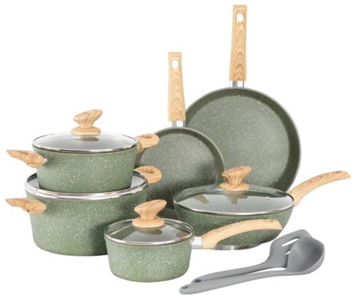 Pannenset, 12-delig, antiaanbaklaag, kookgerei, set pan en pannenset met deksel, pannen en pannenset voor inductie, gasfornuizen en magnetron, groen
