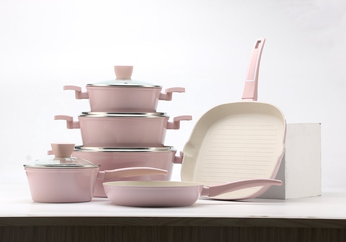 Pannenset - Forged Pannenset - 10 delig - Met glazen deksels- Alle warmtebronnen - Antiaanbaklaag - PFAS-vrij - Marmeren coating - Inductie - Roze - Kookstore.nl