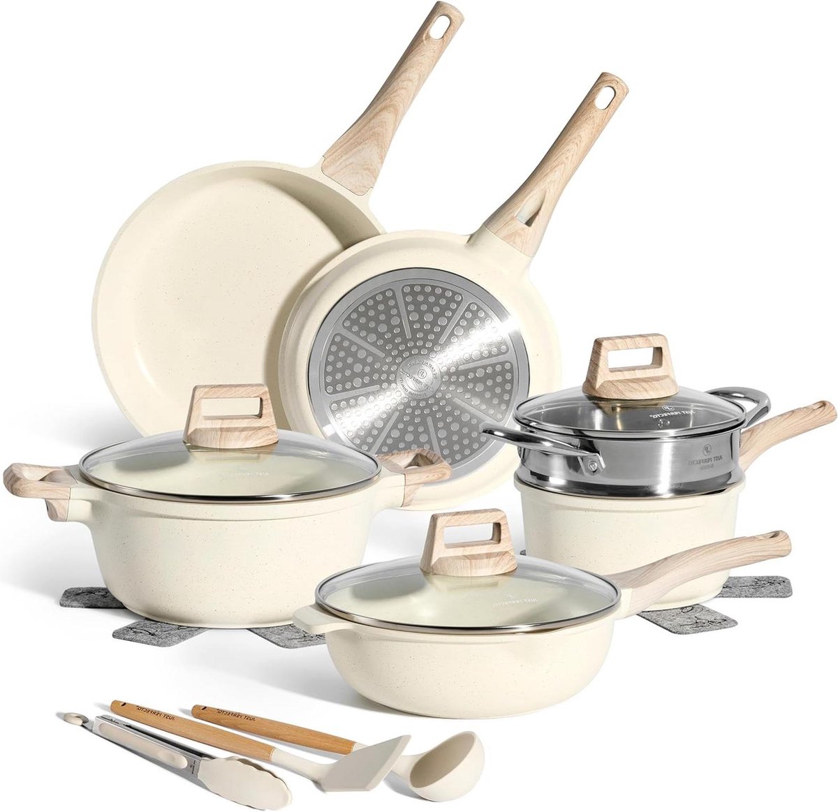 Pannenset Just Perfecto Inductie – Met Deksel – Alle Warmtebronnen – Non-Stick – Glazen Deksel – Anti-Aanbak – Kookpannenset – Zonder PFOA – PFAS – Biege – 14pcs – Small Steamer Pannenset