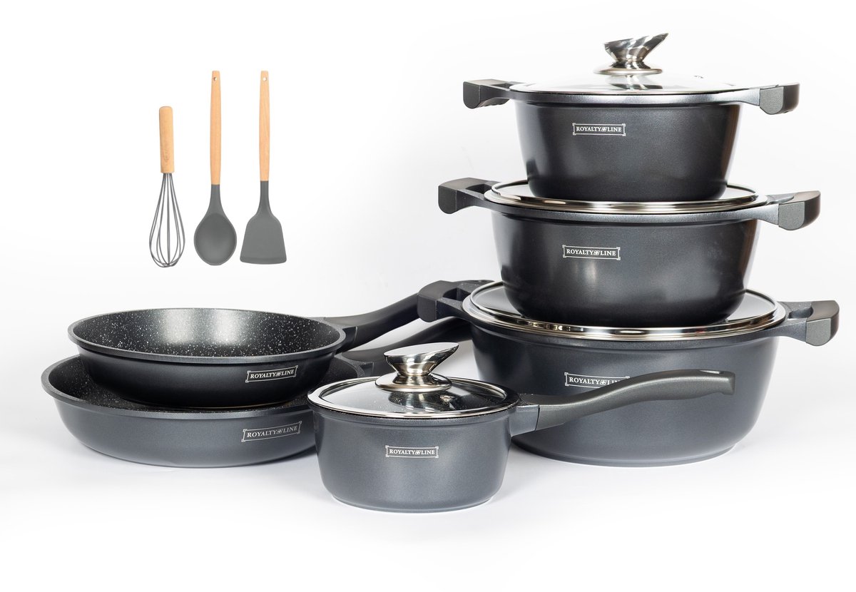Royalty Line® BS1010 Pannenset Inductie – 13 Delige Pannensets Met Antiaanbaklaag – PFOA Vrij – Pannen Voor Alle Warmtebronnen – Grijs