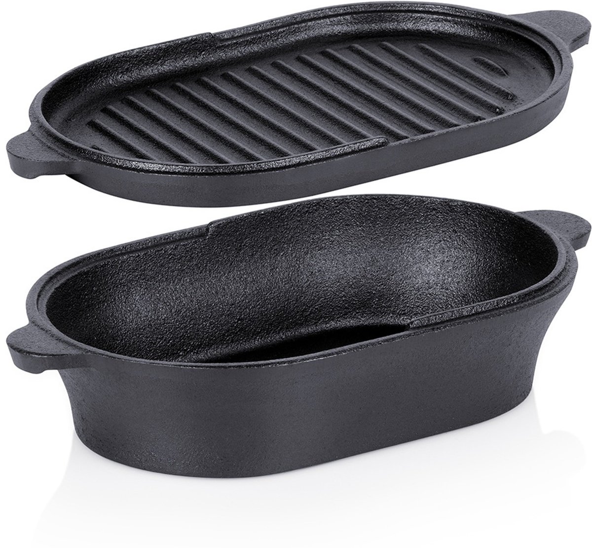 Gietijzeren braadpan 2-in-1 – Kleine braadpan met deksel, die ook als aparte ovenschaal kan worden gebruikt. De braadpan is ideaal voor het bakken, stoven en gratineren van vlees, groenten, aardappelen. Na het verwijderen van het deksel krijgen we twee afzonderlijke schalen. Buitenafmetingen van de braadpan zonder deksel: 28 x 16 x 5,5 cm, de hoogte met deksel is 7,2 cm, en de inhoud l. Het gietijzeren deksel met grilloppervlak heeft afmetingen van 28 x 16 x 2 cm.