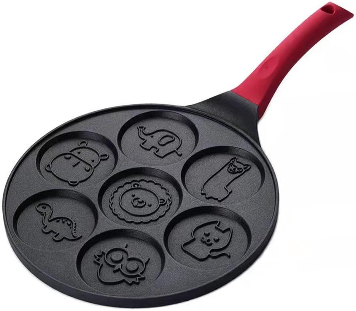 Deze pannenkoekenpan met handvat heeft 7 vormpjes in de vorm van dieren, is voorzien van een antiaanbaklaag, geschikt voor gasfornuizen en is een schattige koekenpan voor het ontbijt. Hij is ook herbruikbaar als eierbakpan en als mini-ontbijtpan.