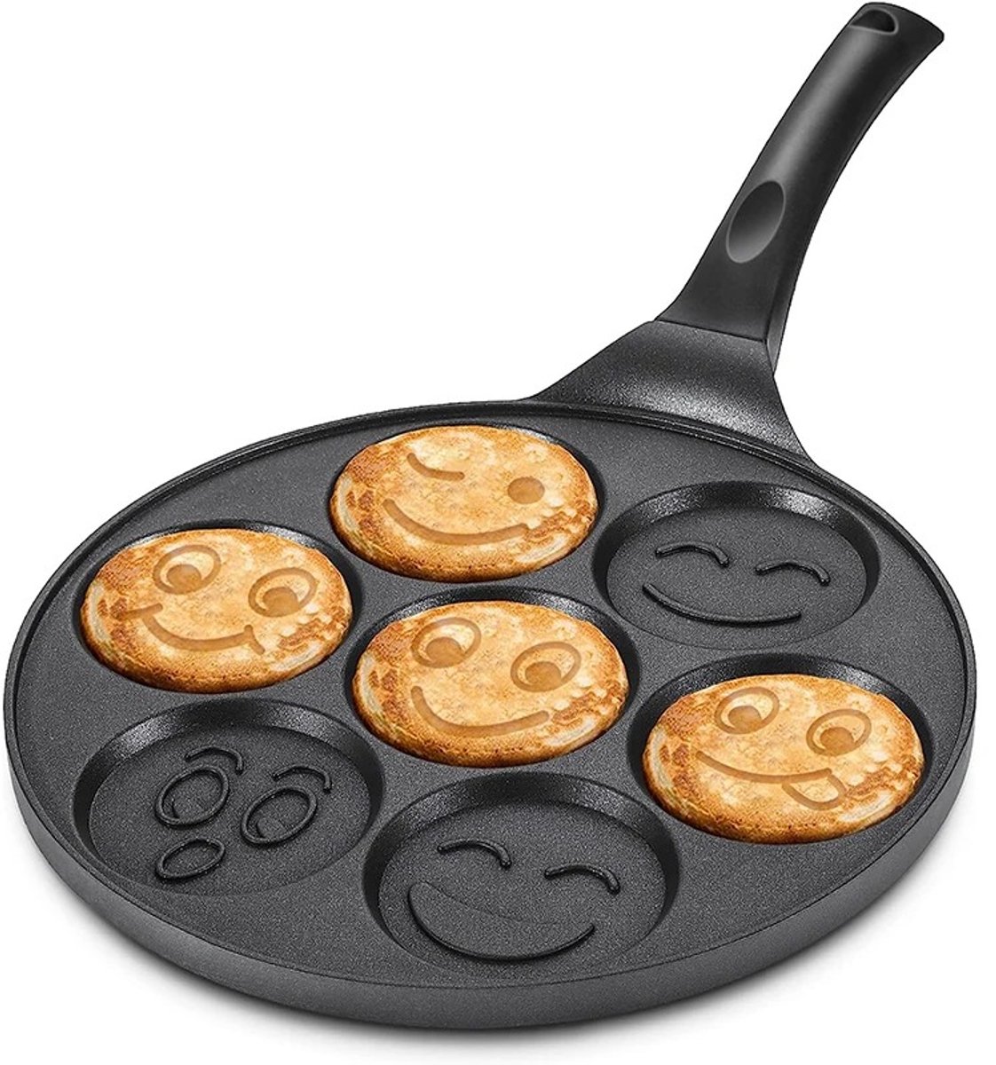 Deze hoogwaardige antiaanbak pan met 7 vrolijke smiley-vormpjes maakt het bereiden van pannenkoeken, eieren en snacks leuker dan ooit. Ideaal voor gezinnen met kinderen, creatieve koks of iedereen die graag een glimlach serveert.