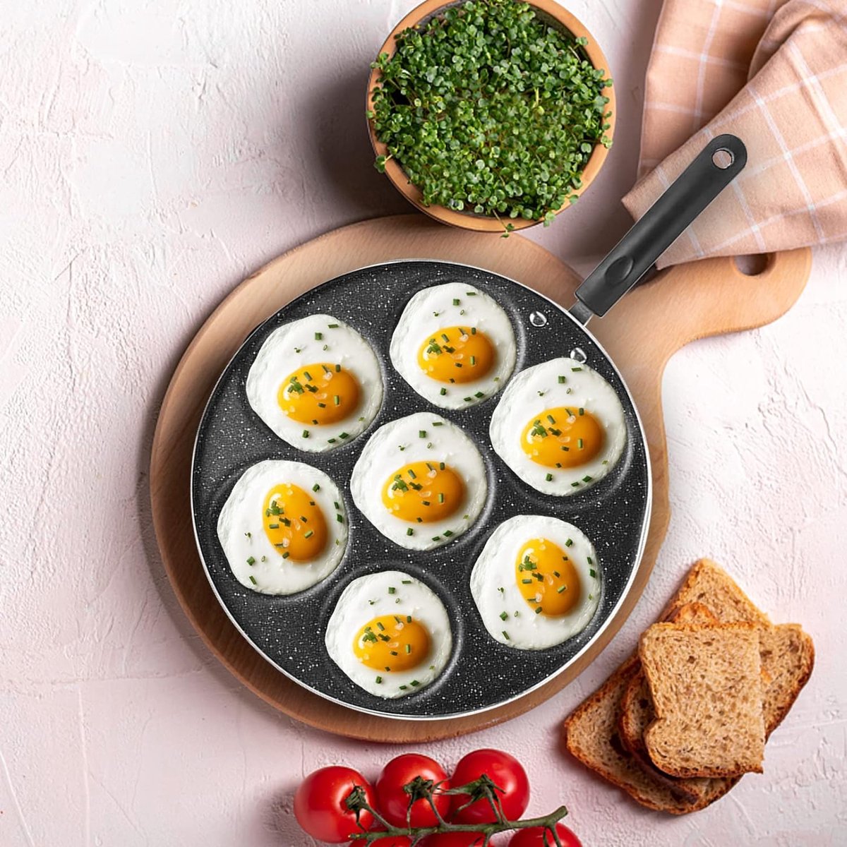 7 RONDE GATEN: De eierpan heeft 7 compartimenten voor snel en eenvoudig koken. Je kunt 7 eieren of een hamburger en andere tegelijk bakken voor je man en kinderen.